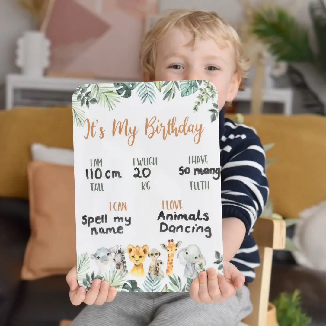 Printed with high quality UV inks onto 3mm white Acrylic, the reusable plaque measures 30cm x 21cm and by using white board markers or chalk pens you can add the details, making this a lasting milestone photo prop.