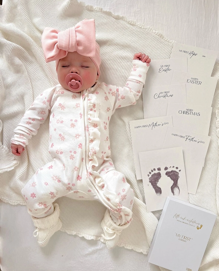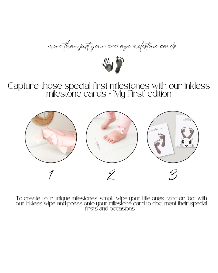 Capture those precious firsts and special occasions of your little one in a truly unique way. We understand just how quickly babies grow and how special it is to document their firsts, and there’s no better way to cherish those memories than by imprinting their tiny hands or feet each month. ‘My First’ edition come complete with 8 cards including: * First Steps * ‘Happy Easter’ with a bunny design to print your little ones footprints as the bunny’s ears * ‘Merry Christmas’ with a reindeer design to print your little ones handprints as the antlers * Plus ‘My first Easter’ AND ‘My first Christmas’ * Happy First Mother’s Day * Happy First Father’s Day * Comprehensive instructions and helpful tips * 8 Inkless Wipes in ‘black’ These cards are printed on specially formulated paper that seems to work like magic.
