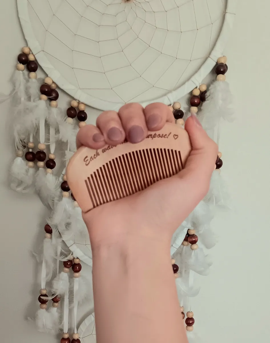 Hold the comb with its teeth positioned just below the meeting point of your fingers and palm. When you sense a contraction approaching, gently close your hand around the comb, allowing its teeth to press into the palm of your hand. Adjust the pressure to your liking, using as much or as little force as feels most soothing and comforting for you.