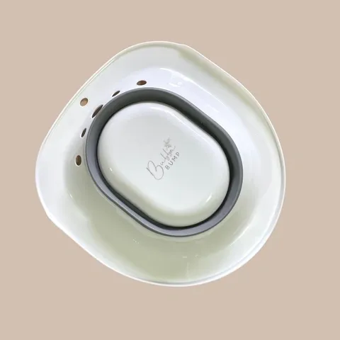 Our sitz bath fits effortlessly on top of your toilet, meaning taking this postnatal healing bath is as easy as 1, 2, 3. No bathtub is needed – just your sitz bath, sitz soak and water. Once done soaking, our smart design means you just tip it down the loo and fold it down into its discreet design. No mess and ultimate postpartum healing! Follow our process step by step.