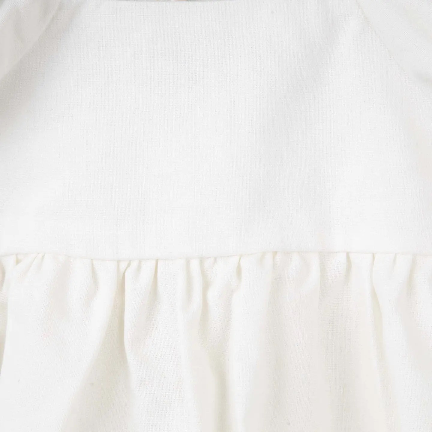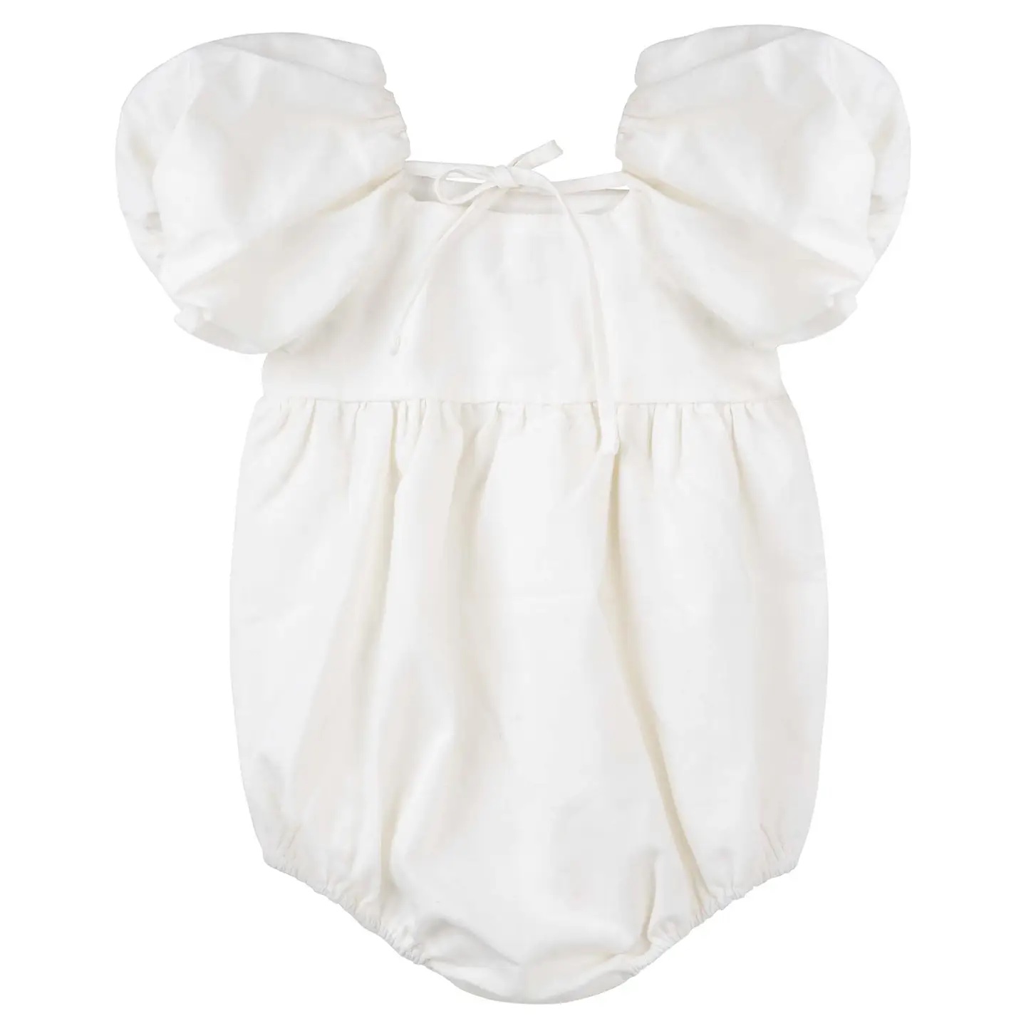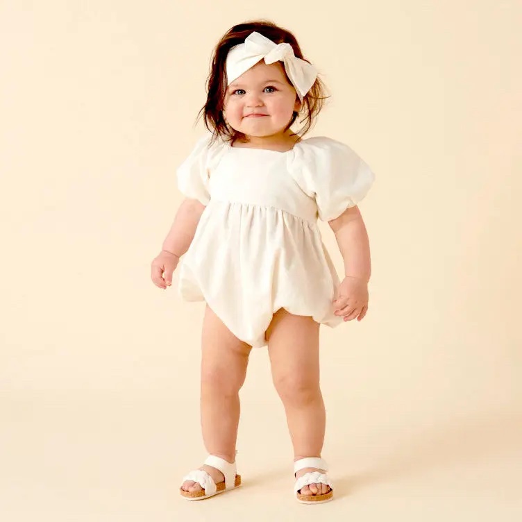 We are IN LOVE with the Grace Tie Back Romper, featuring puff sleeves, gathering at the waist, snap closures at the gusset and cute tie feature and button opening at the back. Don’t forget to pair with our Grace Linen Headband. Ideal for your baby girl’s next wedding, Christmas gathering, birthday party or special occasion!