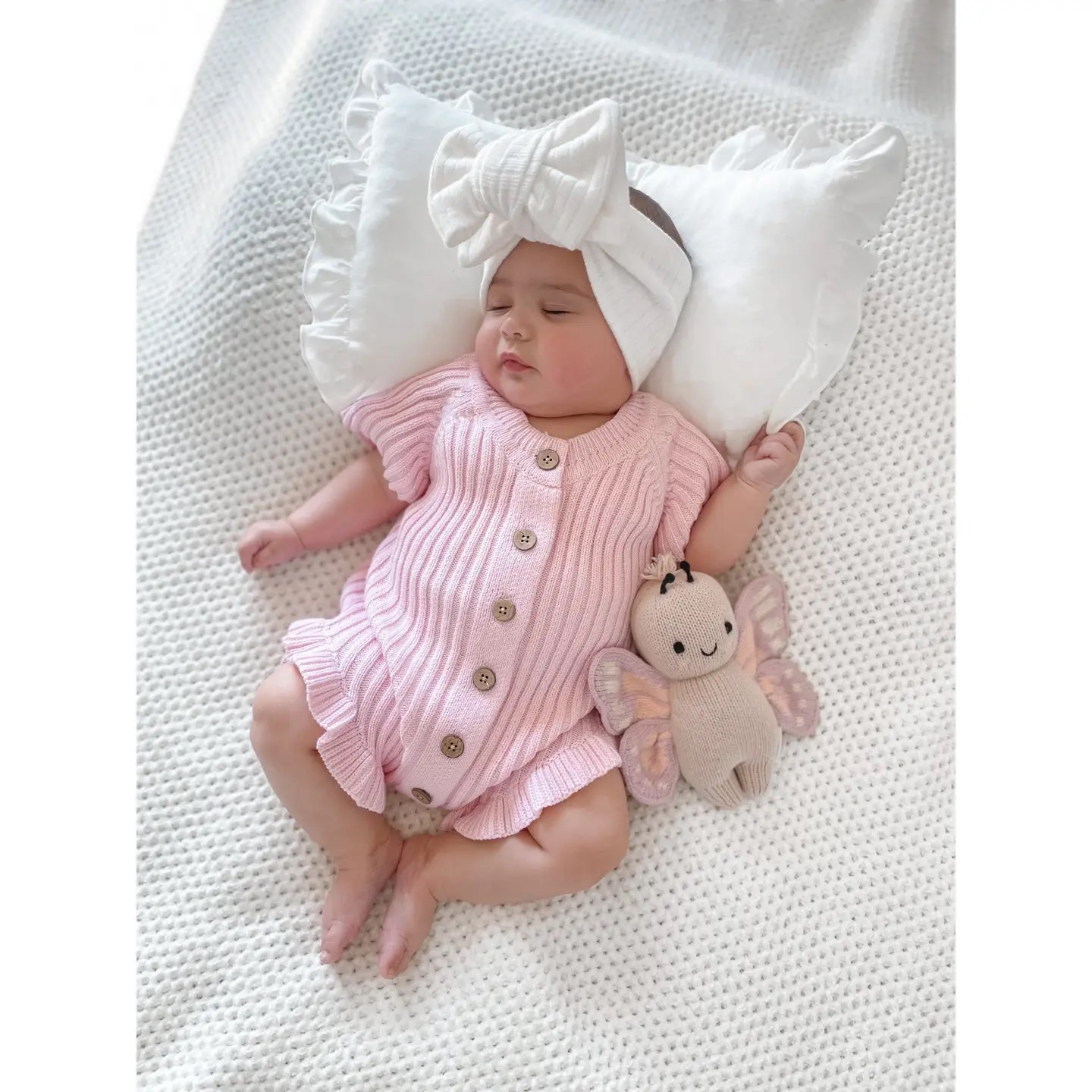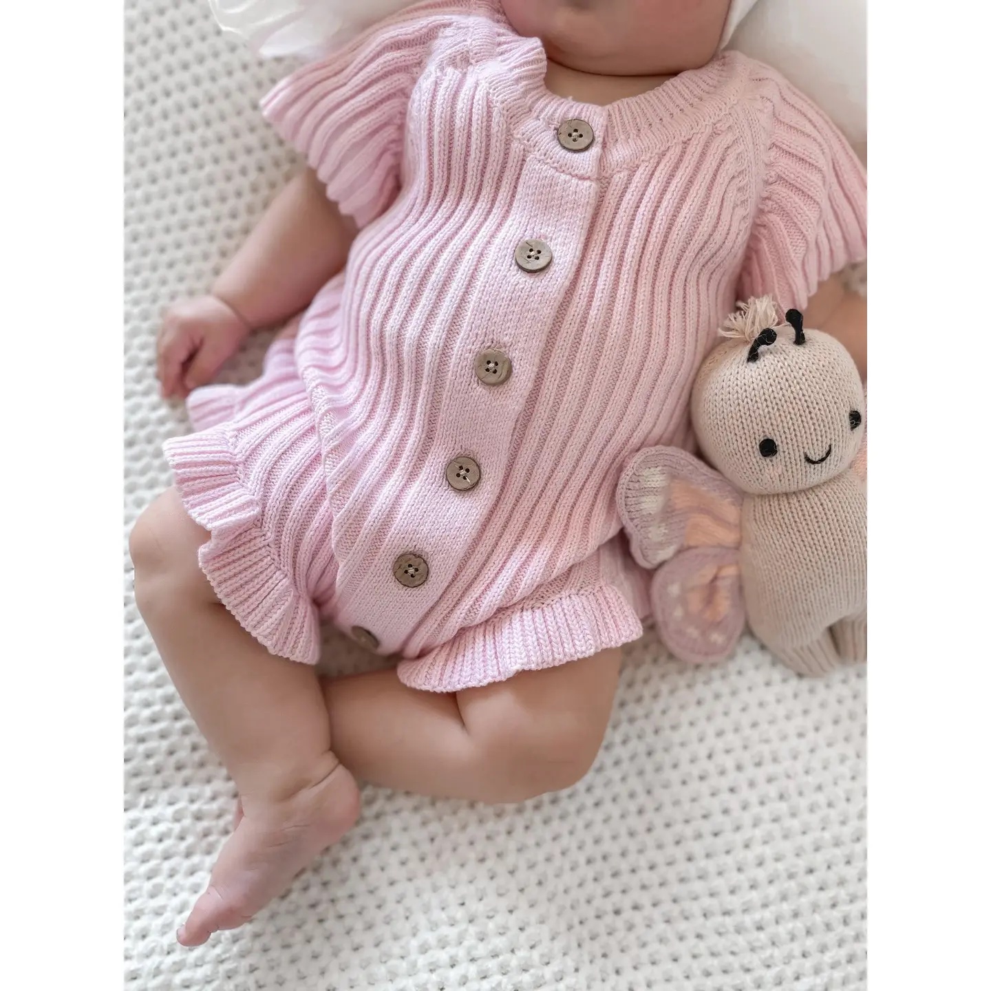 Our Frilled Summer Ribbed onesies, We’ve kept the boho-inspired detailing you know and love – including vintage wooden buttons, short sleeves & legs. NOW we have added a touch of elegance will a sweet Ruffled Frill for your little Baby Girl!