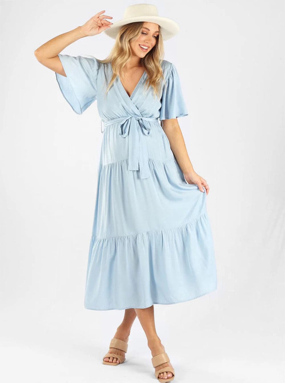 Our Cara Maternity Blue Maxi Dress with a waist tie that can be tied at the front or back. This elegant design is the perfect dress for your baby shower and all occasions.