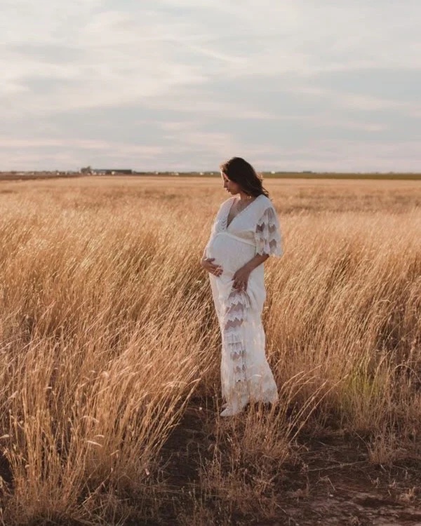 The gorgeous white lace maxi dress is perfect for your maternity photos or baby shower, it featuring half sleeves with sheer white lace, elastic waistband with a removable tie, scallop lace bottoms