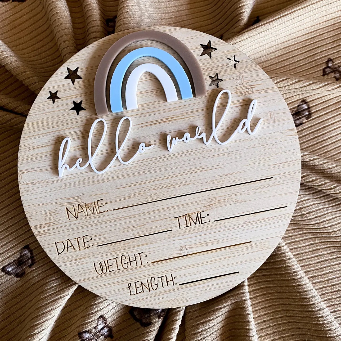 Made on high quality bamboo and 15cm high this rainbow announcement is the perfect keepsake piece where your customers can write their little ones details on there! Hello world in cursive white acrylic and the rainbow is made from blue neutral and white acrylic pieces.