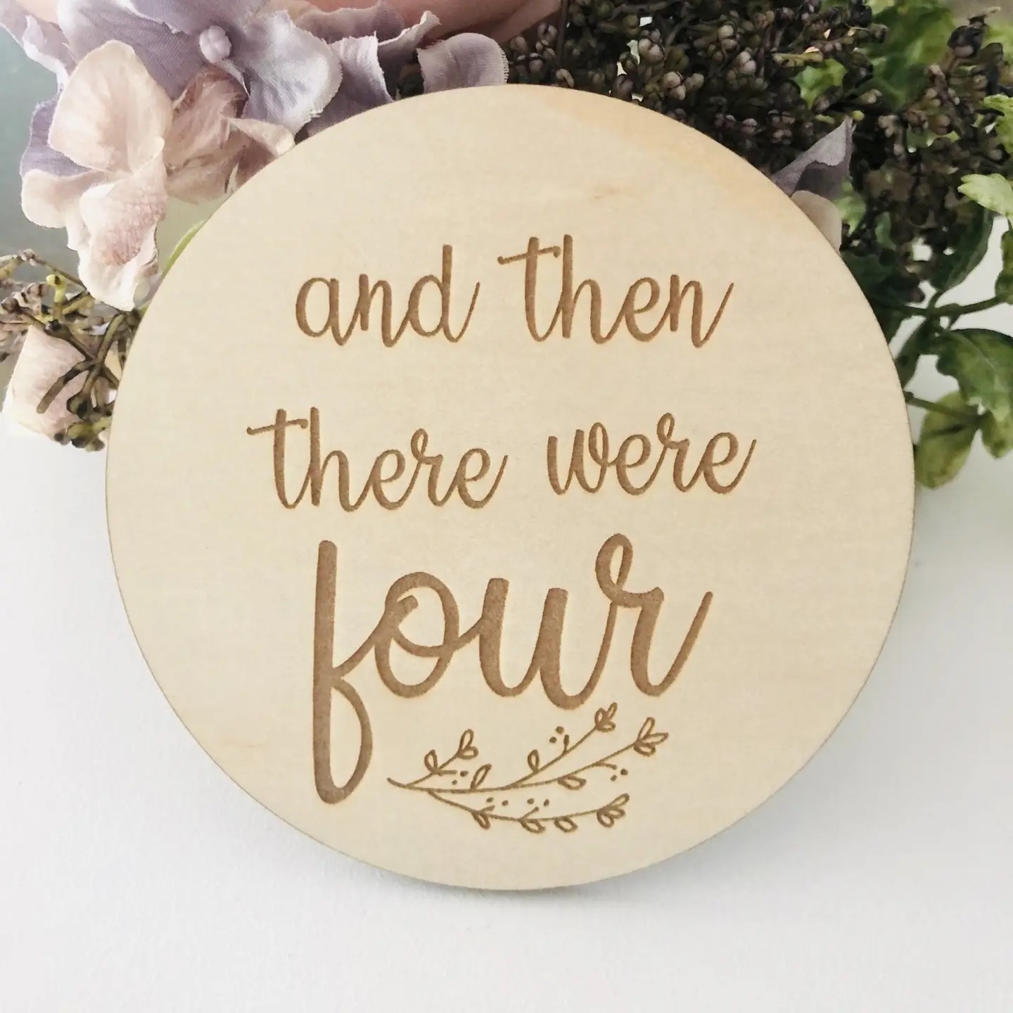 This birth announcement disc is laser carved on a quality 3mm wooden disc with “then there were..” etched with botanical details.