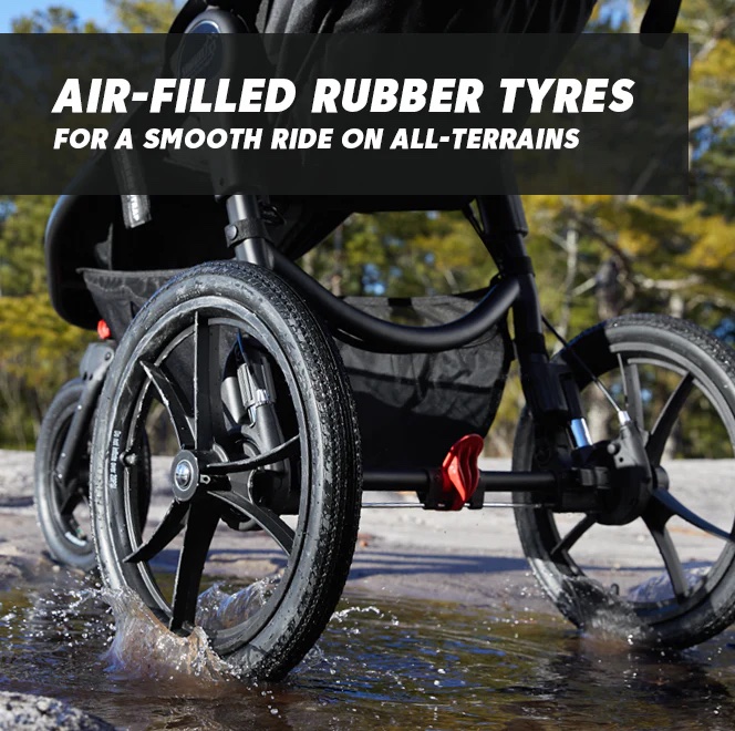 The padded seat reclines nearly flat and is approved for newborns*, and a vented seat top increases airflow when reclined. All-wheel suspension and extra large air filled tyres makes for a smooth ride, whether jogging or strolling, on any terrain. While the signature one-hand compact fold makes it quick to fold and simple to store.